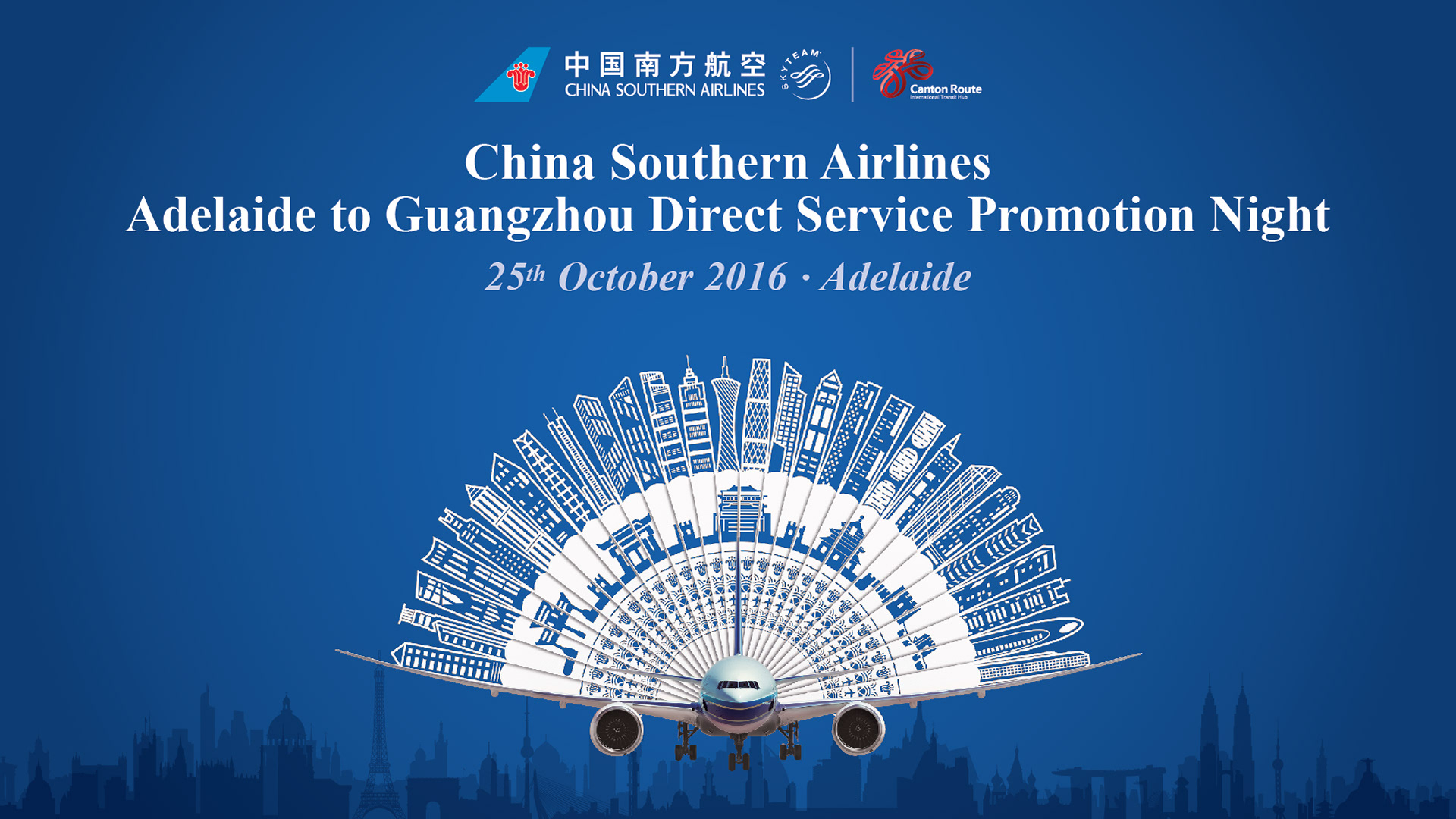 飛機扇子元素是南航很具特色的設計,這次活動客人也希望能夠使用它來做為亮點。再以世界各大城市的標誌性建築來點綴,期許能立足廣州,展望世界。