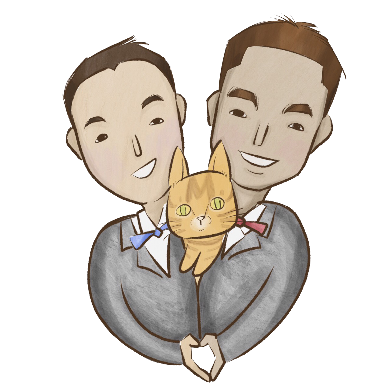 This is the design for my best friend since high school. Being gay growing up in a small town is not easy. We have been through ups and downs together, and extremely lucky to have each other along the journey. I am so happy for him to find the perfect life partner. Han asked me to create a cartoonish version of them as the theme of the wedding. I am not an expert on creating a lively portrait of anything. What I am doing is picturing them in my cartoony realm.